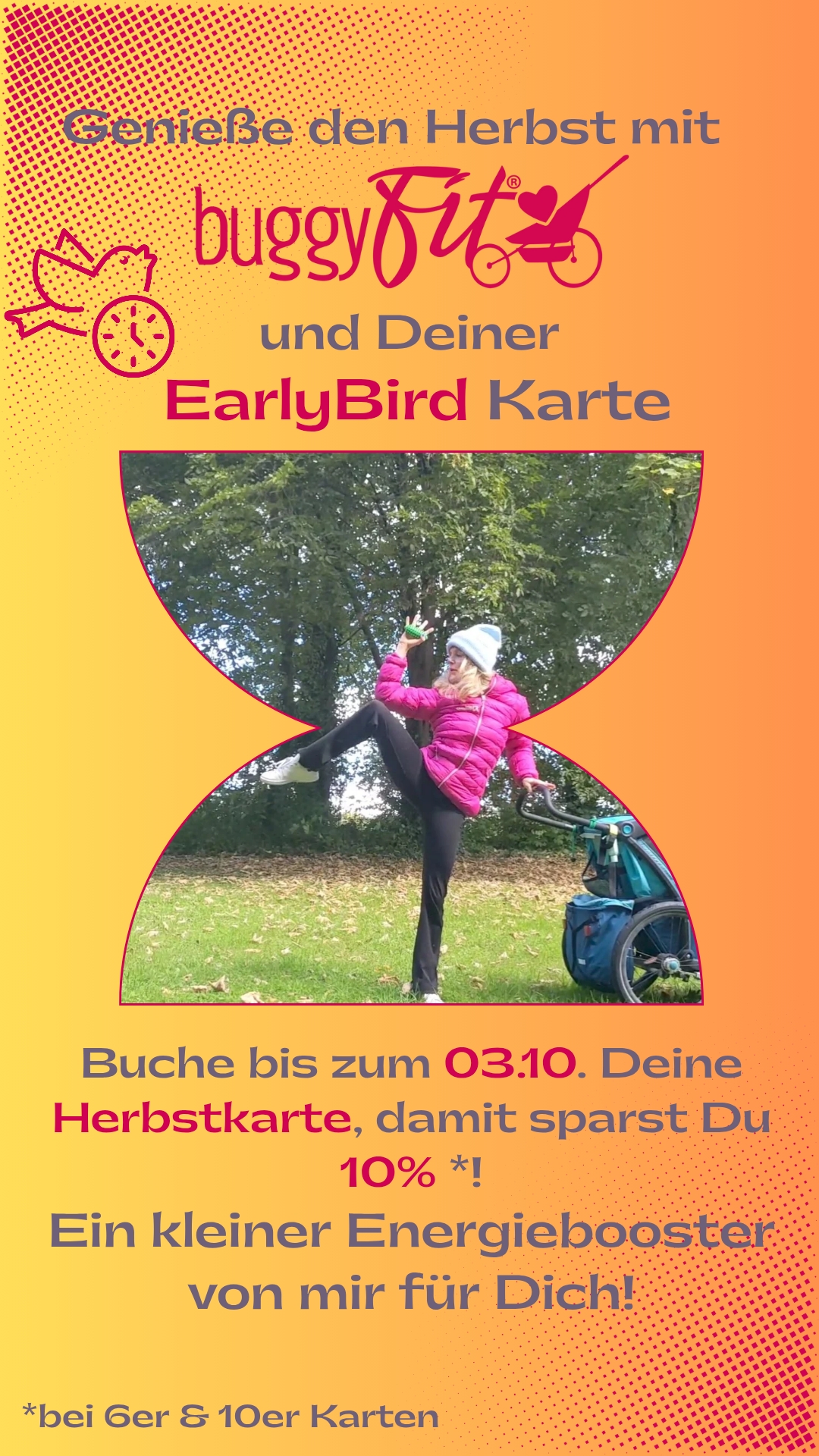 Der Herbst ist da! Es wird früher dunkel und später hell, manchmal weht ein ordentlicher Wind und die ersten Erkältungen nahen... Möchtest Du Dich und Dein Baby gesund und munter halten? Komm zum buggyFit Training! - gönne Dir und Seinem Baby eine Runde Herbstluft - fühle Dich wach und belebt - stärke Deinen Körper und Dein Immunsystem - triff andere Mamas - bleibe auch in der dunklen Jahreszeit in Bewegung -fülle Deinen Energie und VitaminD Speicher -stelle fest, wieviel Freude ein Herbsttraining machen kann und gehe erfrischt und munter durch den Tag Für noch etwas mehr Motivation sparst Du bis zum 03.10.beim Kauf einer EarlyBird Karte 10% auf den regulären Preis! Verbinde Deinen Herbst mit Baby mit Fitness, belebender Herbstluft, Gemeinschaft mit anderen Mamas. Bei buggyFit findest Du mehr als nur Sport. Du kräftigst Dich und Dein Selbstwertgefühl, genießt die bunten Seiten des Herbstes und ich begleite Dich bei Deinen sportlichen Zielen. Ich freue mich auf Dich!
