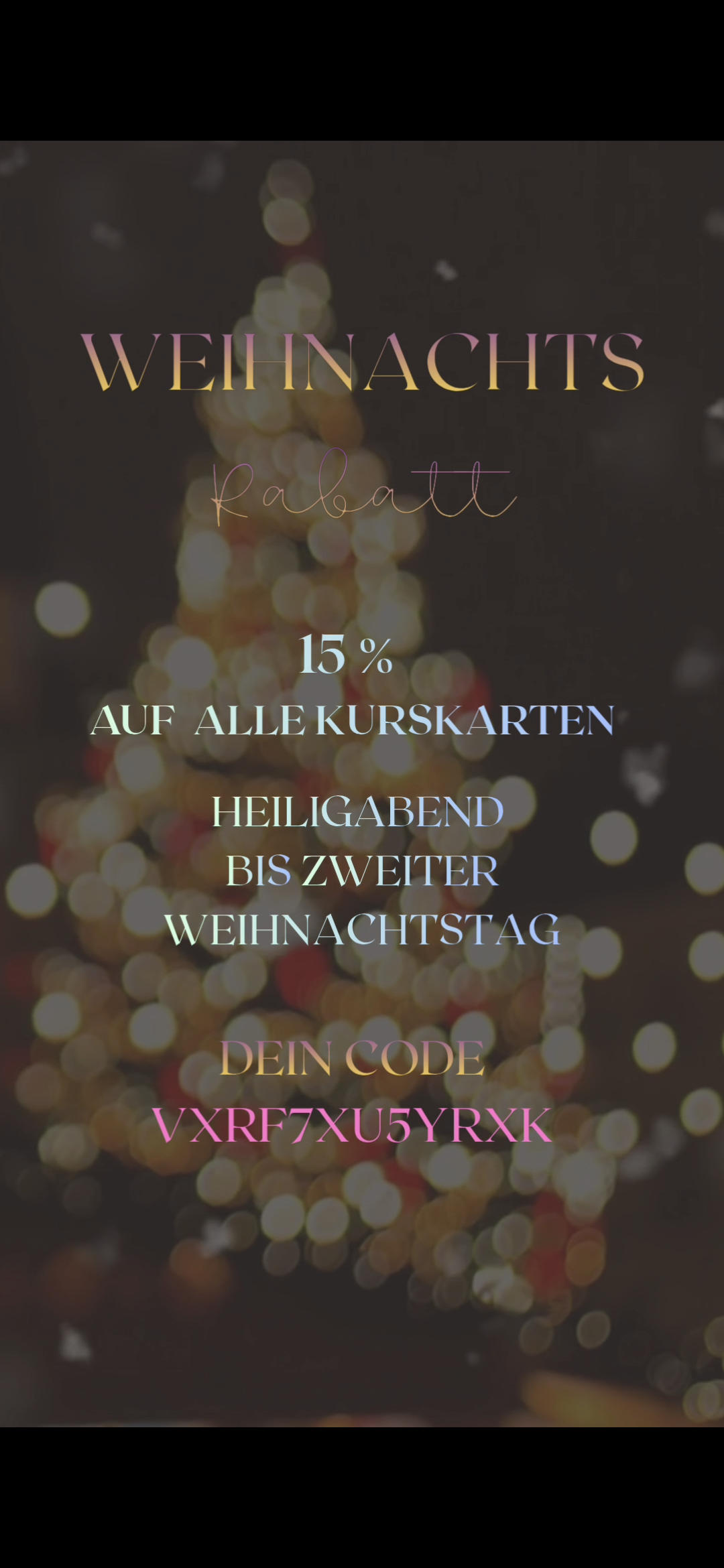 Frohe Weihnachten ihr Lieben, als Dank für Eure Treue durch mein erstes buggyFit Jahr und einfach um etwas Freude zu bereiten, bekommst Du heute bis zum 26.12. 15% Rabatt auf alle Kurskarten. Herzliche Grüße und schöne Feiertage, Kim